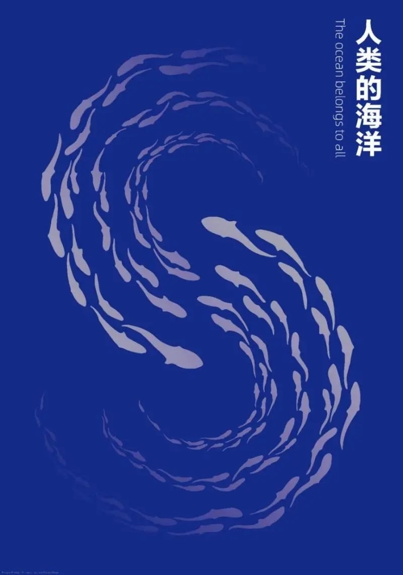 《人類的海洋》采用“S”形魚群為基本骨架,魚群錯落交織游向海洋深處,寓意良好的海洋生態(tài)環(huán)境對魚群等海洋生物穩(wěn)定棲息的益處。造福于海洋,同時也是造福于人類。