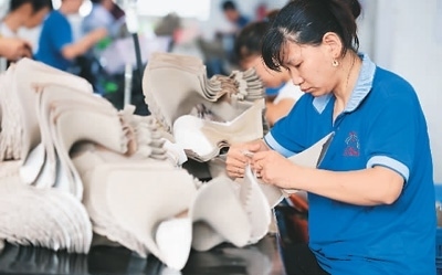 今年以來,福建省福州市倉山區(qū)持續(xù)優(yōu)化營商環(huán)境,進一步加大出口退稅支持力度,為企業(yè)提供精準服務,助力出口外貿企業(yè)積極開拓海外市場。圖為倉山區(qū)一家鞋企生產車間內,工人在生產出口女靴。