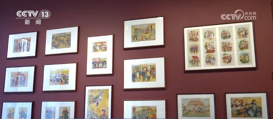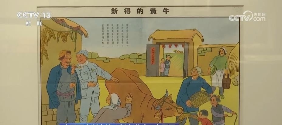 跟隨著講解員,再往前走,國家版本館的特色館藏——年畫、連環(huán)畫和宣傳畫出現在眼前。這面墻上和展柜集中展出了47幅新中國成立初期的新年畫。畫家李可染在1950年創(chuàng)作的《新得的黃?!返茸髌?,展現出老百姓感受到新中國新生活的幸福和美好。