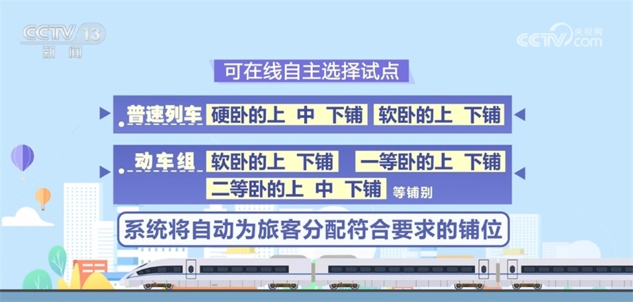如剩余鋪位無法滿足選鋪需求,系統(tǒng)將隨機(jī)分配鋪位,旅客可根據(jù)自身情況選擇接受或者取消。旅客線下購票仍可自主選擇鋪別。有關(guān)在線選鋪服務(wù)試點(diǎn)車次詳細(xì)信息,旅客可通過鐵路12306網(wǎng)站查詢。
