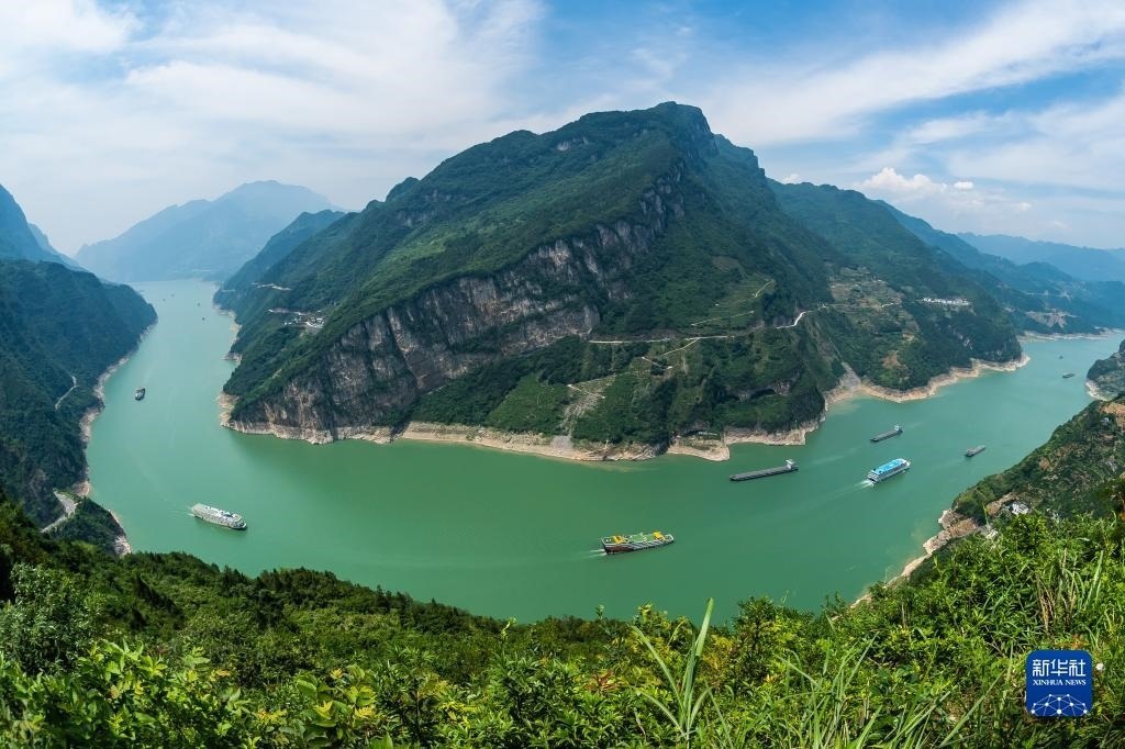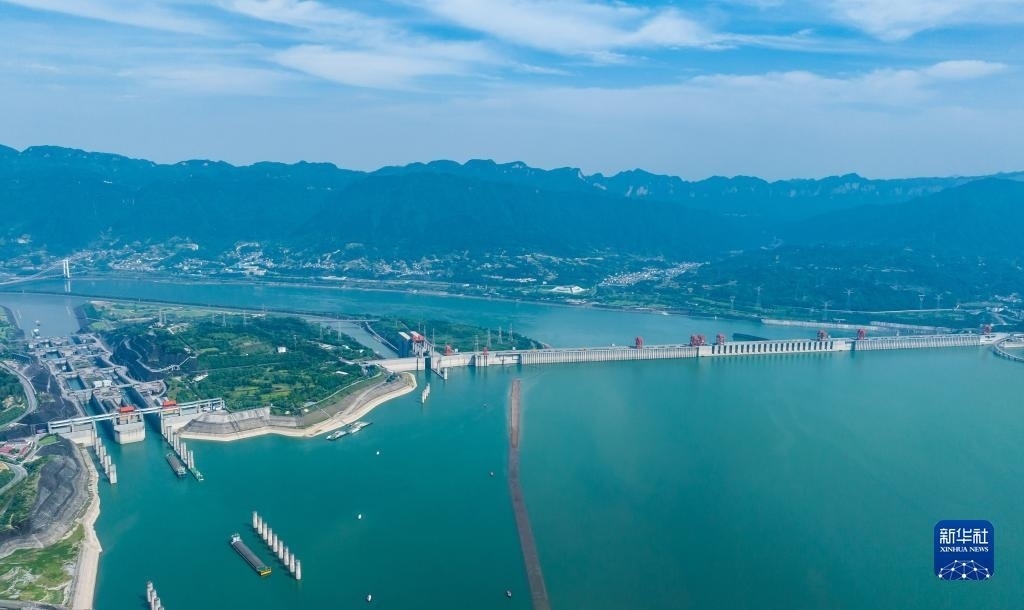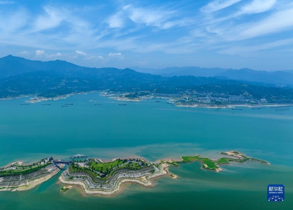 6月10日,船舶從湖北省宜昌市秭歸縣木魚島外沿水域駛過(無人機照片)。