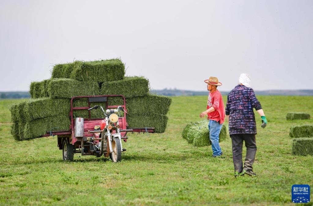 6月10日,鄂托克前旗昂素鎮(zhèn)牧民搬運(yùn)打捆后的紫花苜蓿。