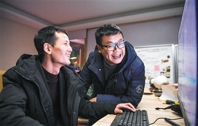國家天文臺阿里觀測站駐站工程師尤顯龍(左)和同事唐鵬在討論觀測到的數(shù)據(jù)。新華社記者 晉美多吉攝