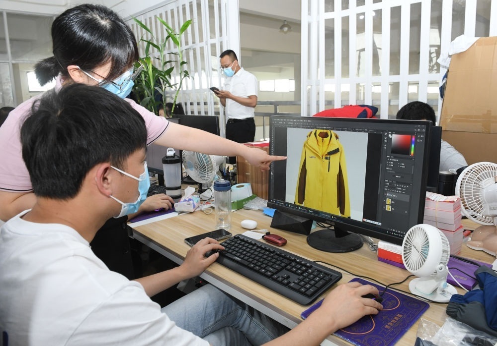 在浙江省臺州市三門縣的一家戶外用品企業(yè),工作人員在討論一款沖鋒衣的設計(2022年6月14日攝)。新華社記者 翁忻旸 攝
