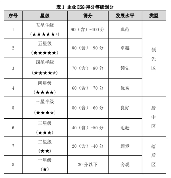 為直觀反映企業(yè)ESG水平,將ESG指數(shù)劃分為八個等級,分別為:五星佳級、五星級、四星半級、四星級、三星半級、三星級、二星級和一星級,各類企業(yè)對應的星級水平和ESG發(fā)展水平見表1。
