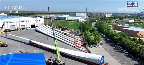 總臺(tái)央視記者 古峻嶺:我現(xiàn)在就在連云港生產(chǎn)超長(zhǎng)風(fēng)電葉片的這個(gè)廠區(qū)。我身后就是這場(chǎng)直播連線的主角——長(zhǎng)達(dá)123米的超長(zhǎng)海上風(fēng)電葉片,像這樣的葉片一共有3支,我們可以看到此刻它已經(jīng)完成了正式安裝前的所有檢測(cè)工作,剛剛吊裝到一輛65米長(zhǎng)的專用平板運(yùn)輸車上,即將開啟陸地轉(zhuǎn)運(yùn)的第一步。