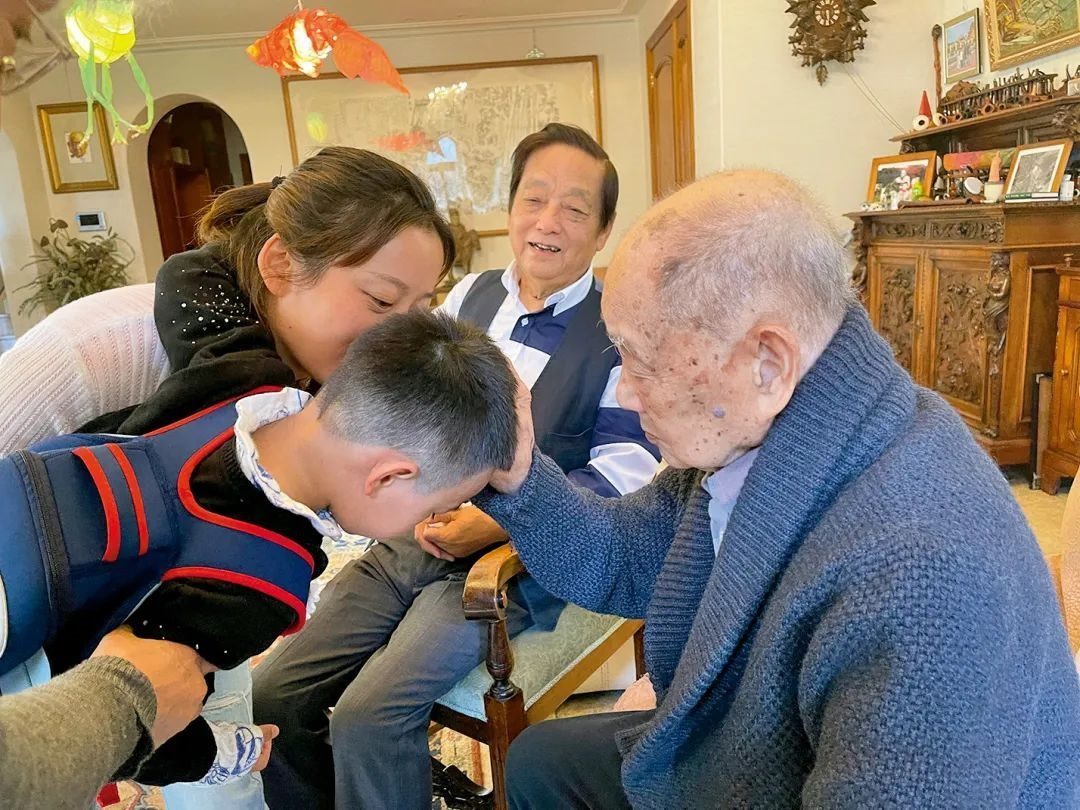 黃老看到天予甚為高興,美林請(qǐng)黃老摸摸兒子的頭,說(shuō)讓黃老加持下,未來(lái)成為“小黃永玉”。黃老高興地摸著天予的頭,天予對(duì)黃老說(shuō):“我理發(fā)了”,這一句話(huà)把黃老逗笑了。