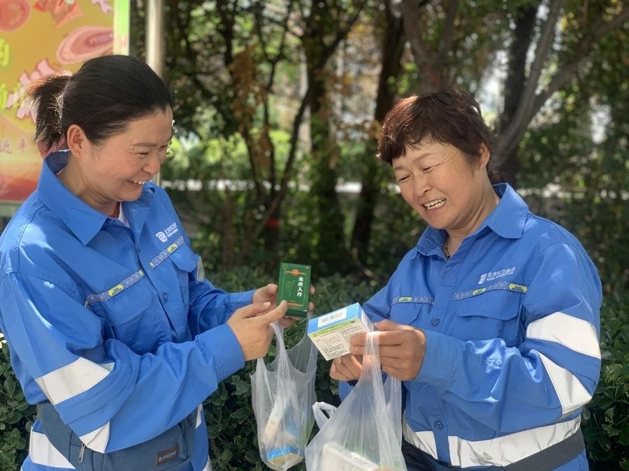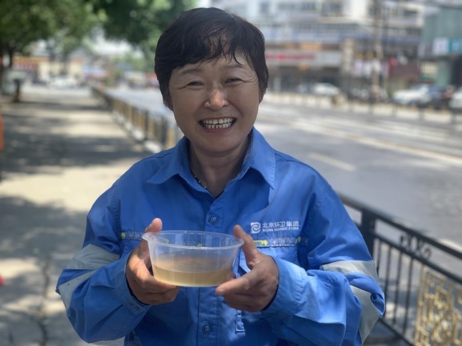 環(huán)衛(wèi)管理部門為環(huán)衛(wèi)工準備了綠豆水和防暑藥品。