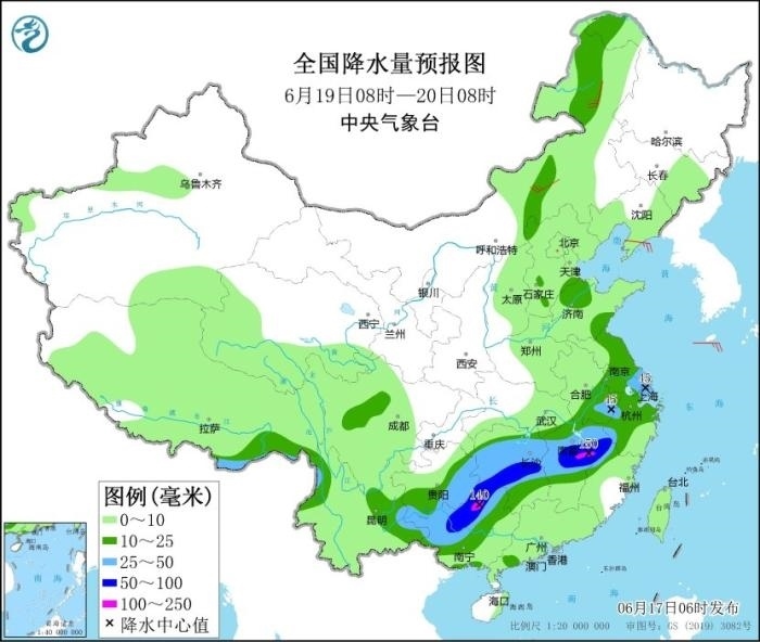 17日至19日,西南地區(qū)東部、江漢、江淮、江南、華南等地有大范圍較強降雨過程,部分地區(qū)有大到暴雨,局地大暴雨,并伴有短時強降水、雷暴大風等強對流天氣。其中,6月17日08時至18日08時,江淮大部、江漢大部、湖南北部、重慶中東部、貴州北部、廣西北部和南部沿海、廣東中南部、福建南部以及西藏東南部、云南西北部等地部分地區(qū)有大到暴雨,其中,湖北東部、重慶東南部、貴州東北部、廣東中南部等地部分地區(qū)有大暴雨(100~150毫米)。上述部分地區(qū)伴有短時強降水(最大小時降雨量20~60毫米,局地可超過70毫米),局地有雷暴大風等強對流天氣。中央氣象臺6月17日06時繼續(xù)發(fā)布暴雨藍色預警。