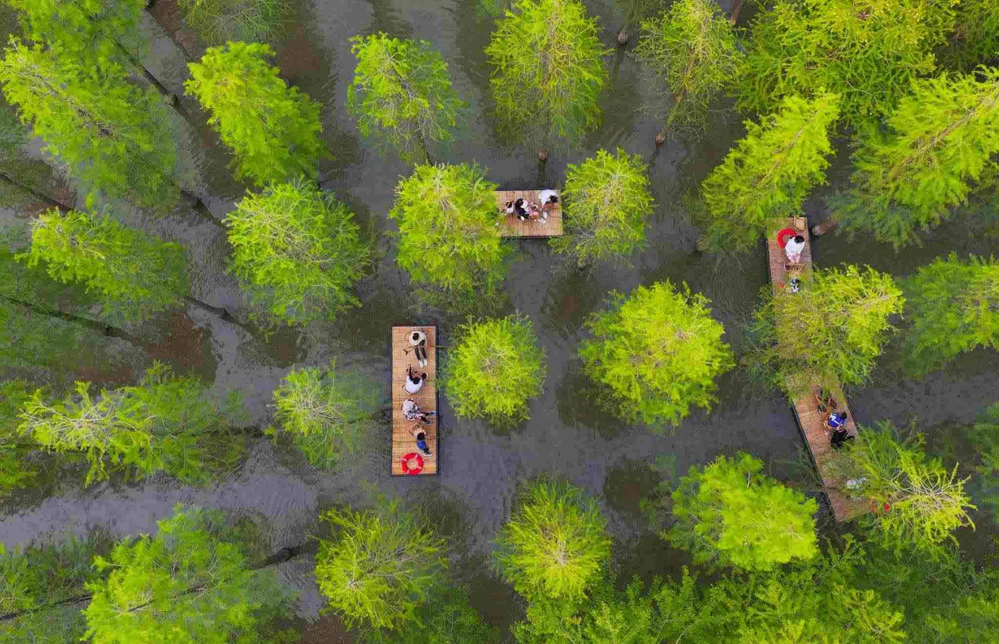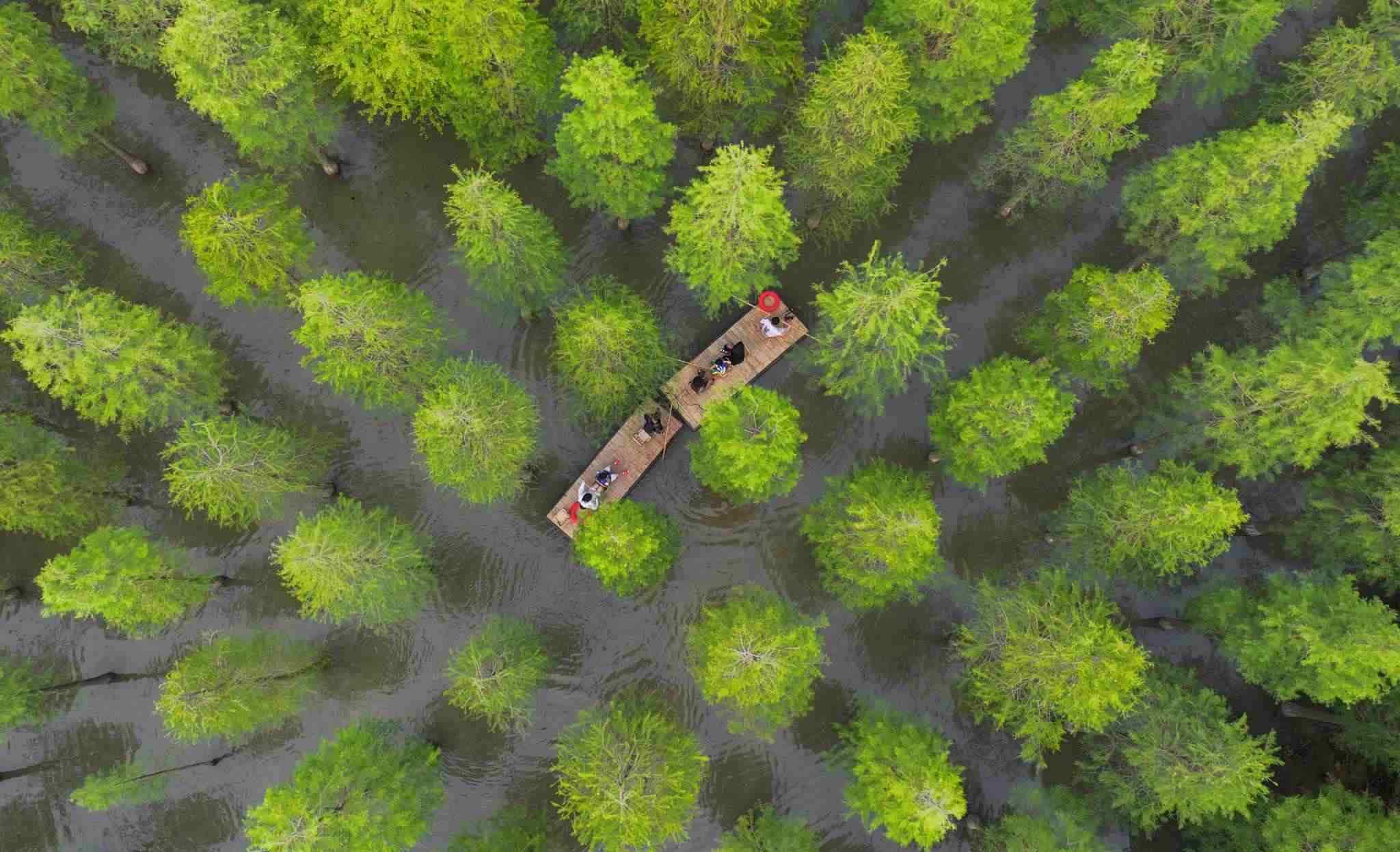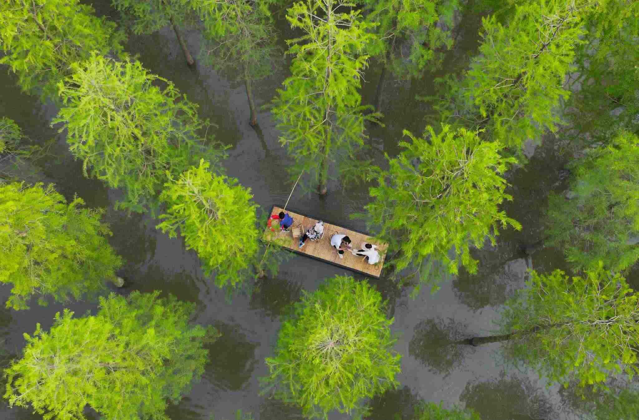 2023年6月16日,江蘇省宿遷市,泗洪縣洪澤湖濕地水杉林滿目蒼翠、郁郁蔥蔥,游客乘坐竹筏,在水杉林間穿梭游玩。視覺中國