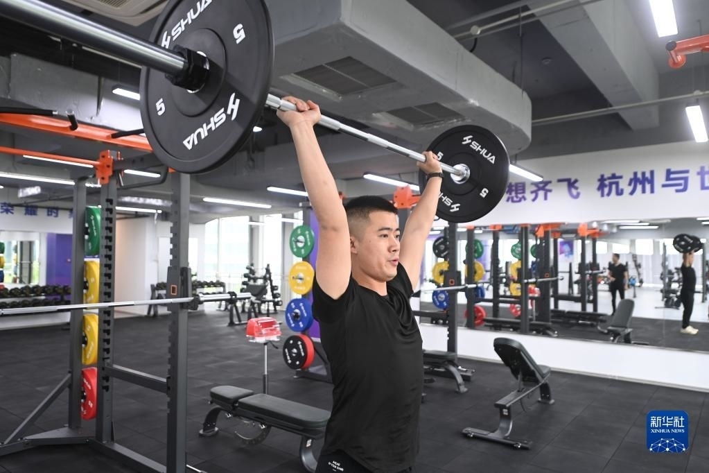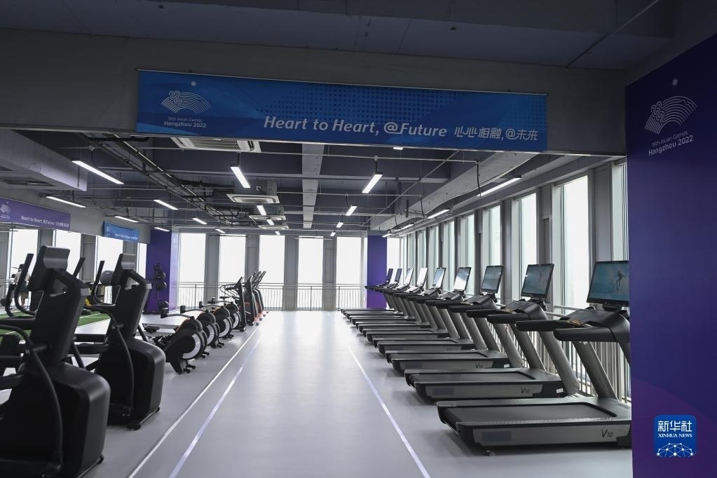 這是6月16日拍攝的杭州亞運村健身中心內(nèi)景。健身中心設置有氧運動區(qū)、爆發(fā)力訓練區(qū)、拉伸恢復區(qū)、綜合器械區(qū)及功能性訓練區(qū),可容納約350名運動員同時使用。