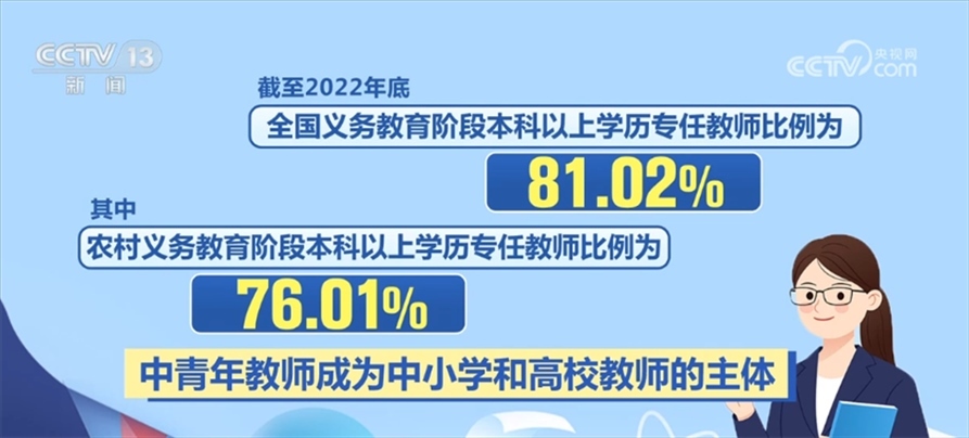 近年來,“特崗計劃”、“三區(qū)”人才支持計劃教師專項計劃等源源不斷地為鄉(xiāng)村學校補充高素質教師。優(yōu)師計劃、師范教育協(xié)同提質計劃、國優(yōu)計劃等的實施,也在助力優(yōu)秀教師的培養(yǎng)。我國各級各類教師隊伍學歷不斷提高、年齡結構不斷優(yōu)化。截至2022年底,全國義務教育階段本科以上學歷專任教師比例為81.02%,其中,農村義務教育階段本科以上學歷專任教師比例為76.01%,中青年教師成為中小學和高校教師的主體。