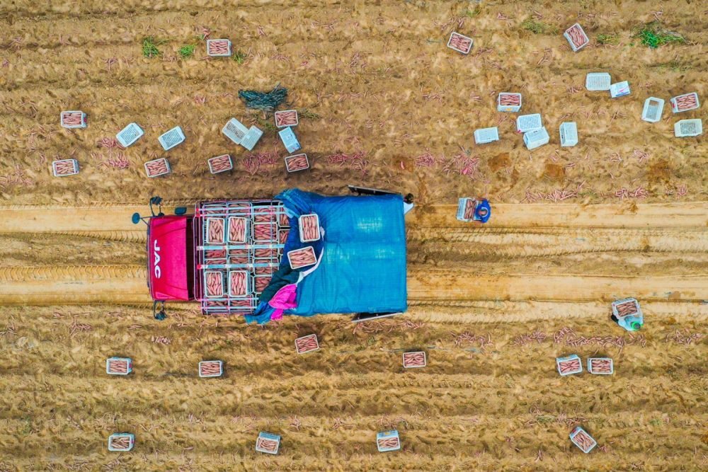 ↑2023年8月21日,河南省濮陽(yáng)市清豐縣古城鄉(xiāng)齊家村,農(nóng)民在將采收的紅薯裝筐。CICPHOTO/紀(jì)全舉 攝