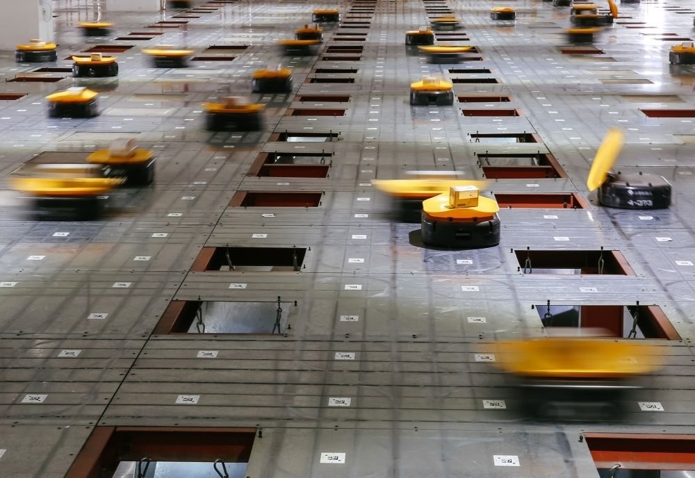 ↑2017年5月3日,在義烏申通公司,機(jī)器人運(yùn)載包裹進(jìn)行分揀。
