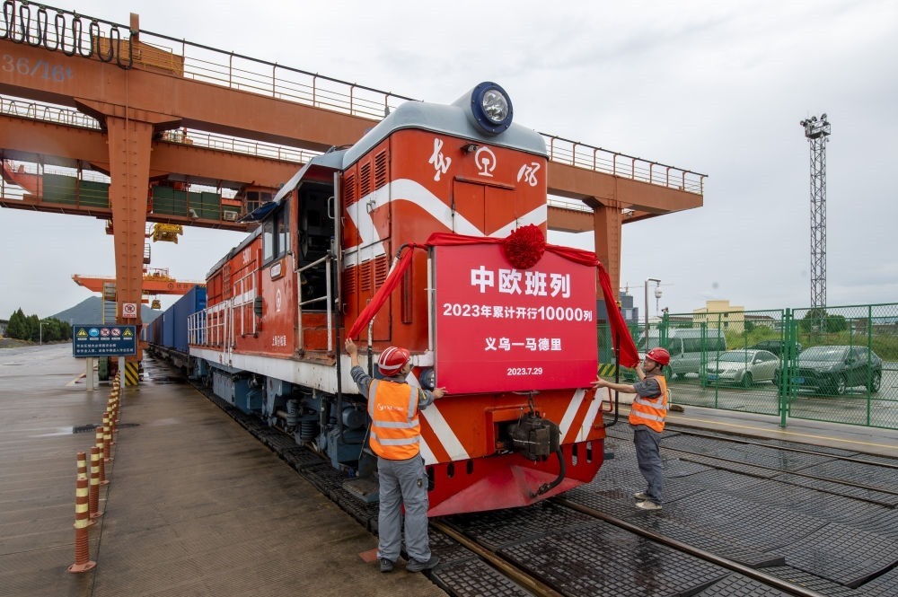 ↑2023年4月23日在義烏西站拍攝的“義烏-中亞五國(guó)10周年紀(jì)念號(hào)”中歐班列。