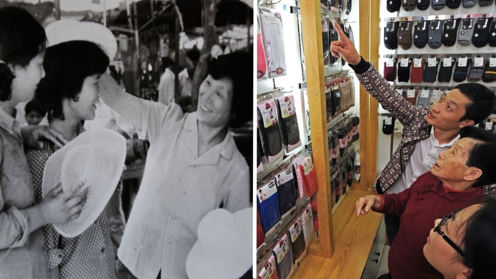 ↑拼版照片,左圖為:義烏小商品市場(chǎng)第一代經(jīng)營(yíng)戶馮愛倩(右)在向顧客推銷遮陽(yáng)帽(攝于上個(gè)世紀(jì)80年代);右圖為:2018年10月25日,78歲的馮愛倩(中)在傾聽她的孫子、義烏國(guó)際商貿(mào)城經(jīng)營(yíng)戶楊帆(上)介紹他自產(chǎn)自銷的新款襪子。楊帆大學(xué)畢業(yè)后當(dāng)上了父親創(chuàng)辦的襪業(yè)公司的總經(jīng)理。