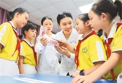 不久前,在湖南省衡陽(yáng)市雁峰區(qū)環(huán)城南路小學(xué),南華大學(xué)衡陽(yáng)醫(yī)學(xué)院醫(yī)路陽(yáng)光口腔健康科普協(xié)會(huì)的志愿者在教小學(xué)生們?nèi)绾握_刷牙。
