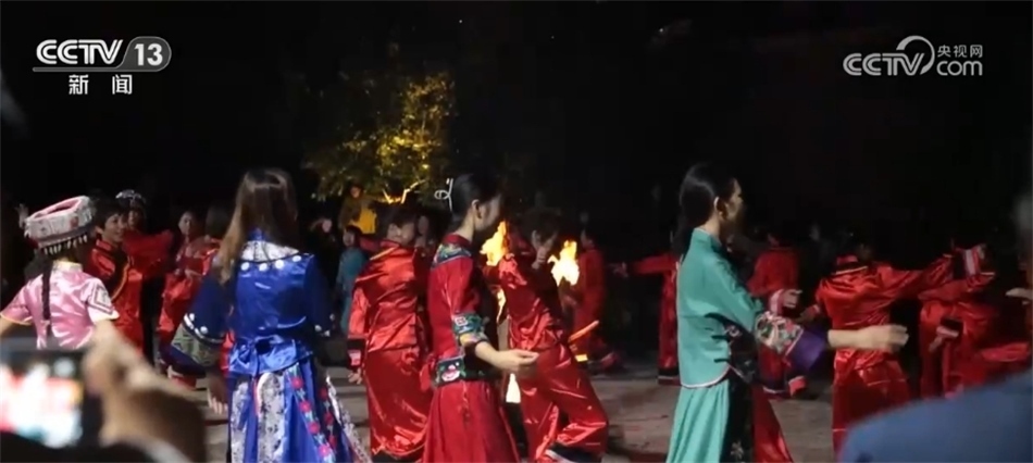 隨著歡快的音樂響起,當(dāng)?shù)卮迕翊┥仙术r艷的節(jié)日盛裝,踏著鼓點,圍著篝火跳起土家擺手舞,豐收的喜悅洋溢在村民們的臉上,游客們加入其中,大家手牽著手,共同舞出金秋和美鄉(xiāng)村新畫卷。