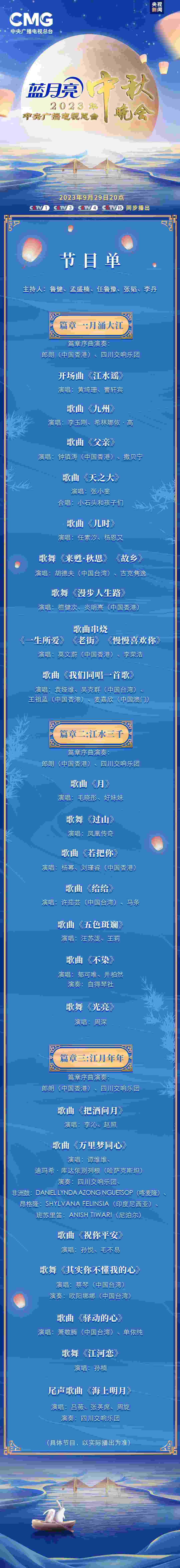 一年逢好夜,萬里見明時(shí)。9月29日晚8時(shí),《中央廣播電視總臺2023年中秋晚會》將與全球受眾見面,晚會節(jié)目單正式發(fā)布。