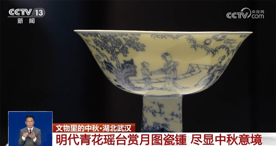 湖北省博物館珍藏的這件明代青花瑤臺賞月圖瓷鍾,造型獨特、工藝精湛,繪有遠山、祥云、花草以及三組人物,這三組人物共賞一輪圓月,意境優(yōu)美。