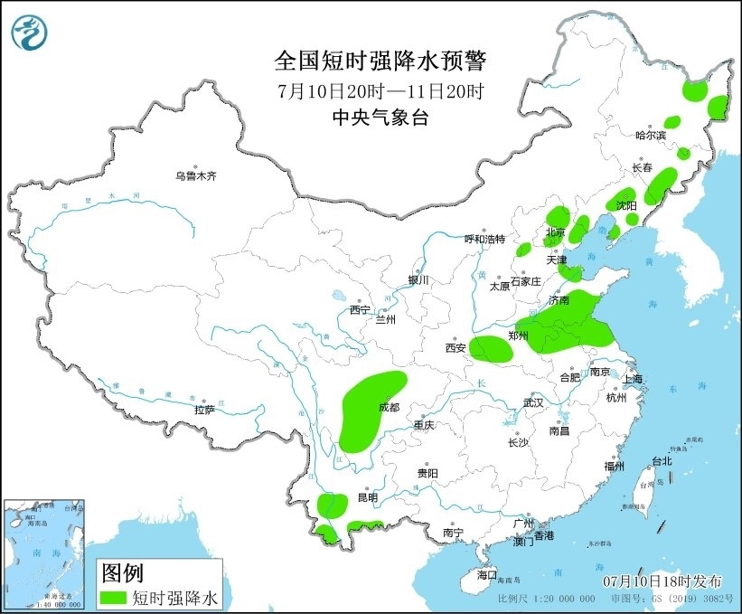 央視網(wǎng)消息:中央氣象臺(tái)7月10日18時(shí)繼續(xù)發(fā)布強(qiáng)對(duì)流天氣藍(lán)色預(yù)警,預(yù)計(jì)7月10日20時(shí)至11日20時(shí),黑龍江東北部、河北北部、北京東南部、天津北部、山東南部、河南東部、安徽北部、江蘇北部、川西高原南部和四川盆地西南部等地的部分地區(qū)將有8-10級(jí)雷暴大風(fēng)或冰雹天氣;黑龍江東部、吉林東部、遼寧、陜西東南部、河北中北部、北京東部、天津北部、山東西北部和南部、河南東部和西南部、安徽北部、江蘇中北部、川西高原、四川盆地西部、云南中南部等地的部分地區(qū)將有短時(shí)強(qiáng)降水天氣,小時(shí)雨量30-50毫米,局地可達(dá)60毫米以上。