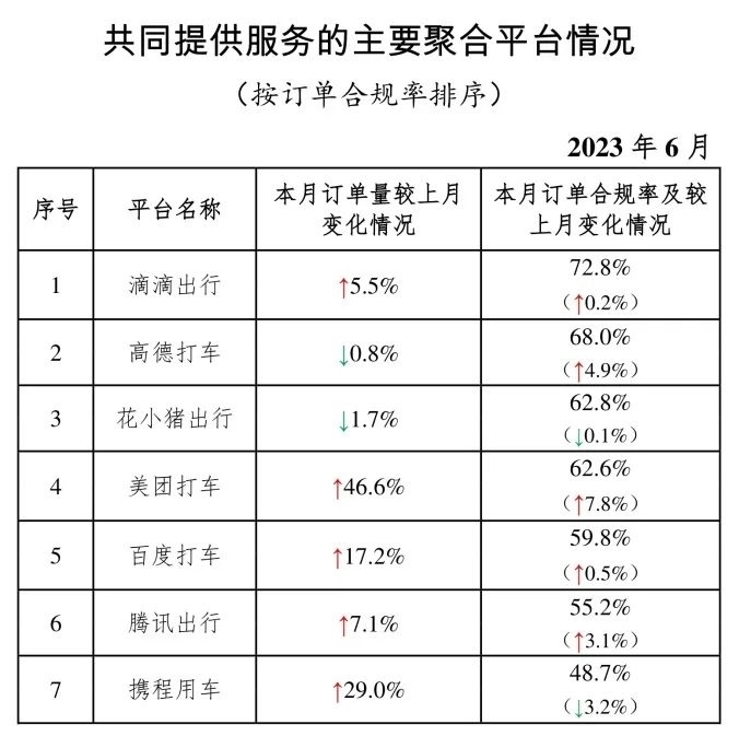 其中,面向乘客、與網(wǎng)約車平臺(tái)公司共同提供服務(wù)的平臺(tái)(俗稱“聚合平臺(tái)”)完成2.18億單,環(huán)比上升4.0%。按訂單合規(guī)率由高到低的分別是滴滴出行、高德打車、花小豬出行、美團(tuán)打車、百度打車、騰訊出行、攜程用車。