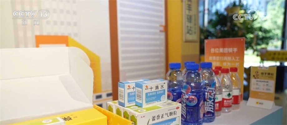 記者在北京市某防暑驛站看到,中午十二點(diǎn),外賣騎手正在送單的空閑間隙里休息。這里不僅備有解熱鎮(zhèn)痛類、止瀉類、防暑類功能藥品,還有冷飲、西瓜等消暑餐食,像這樣的防暑驛站在全國有7000多個(gè)。
