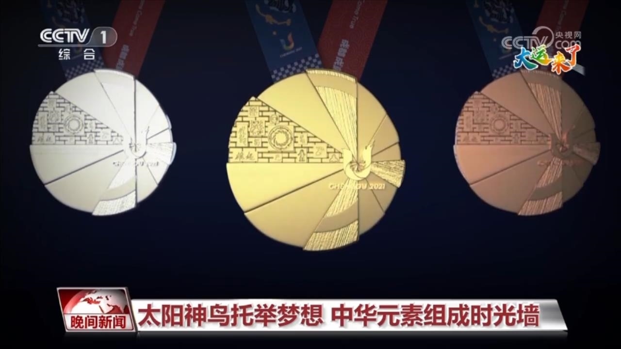 再來看圖案。獎牌正面設計賦予“太陽神鳥”羽翼幾何感,與賽會會徽“U”呼應,猶如神鳥,振翅欲飛,寓意守護夢想,自信昂揚,飛往多彩未來。同時,在幾何扇面嵌入一塊包含多種中華文明代表元素為底紋的絢麗時光墻,以呈現(xiàn)中國五千年文明的璀璨輝煌和演變歷史。