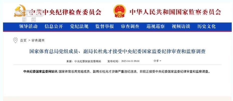 總臺央視記者 宋琎:今年3月27日,二十屆中央首輪巡視對象名單公布?!皩殷w育總局黨組開展機動巡視”這一消息迅速成為社會熱點。之后不到一周,中央紀委國家監(jiān)委通報,時任國家體育總局黨組成員、副局長杜兆才接受審查調查。體育領域反腐成為今年反腐敗工作的一大重點。