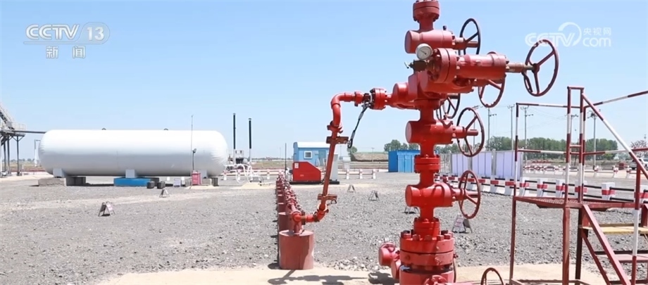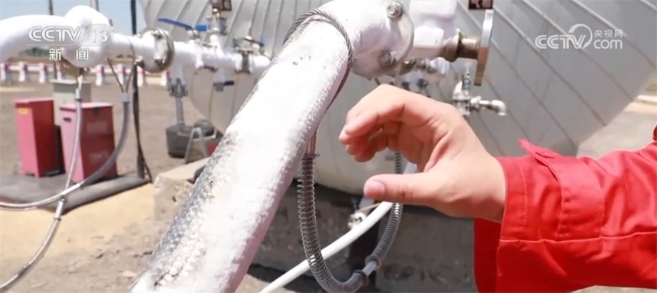 總臺(tái)記者 閆崎峰:可以看到我旁邊的這些管線上凝結(jié)了厚厚的白霜,管子里運(yùn)輸?shù)木褪堑蜏匾簯B(tài)下的二氧化碳。這些二氧化碳被這些高壓泵送入距離我腳下4000多米的原油層中。加入了二氧化碳的原油會(huì)變得蓬松、流動(dòng)性好,便于采集,這種方式可以提高至少18%的采收率。