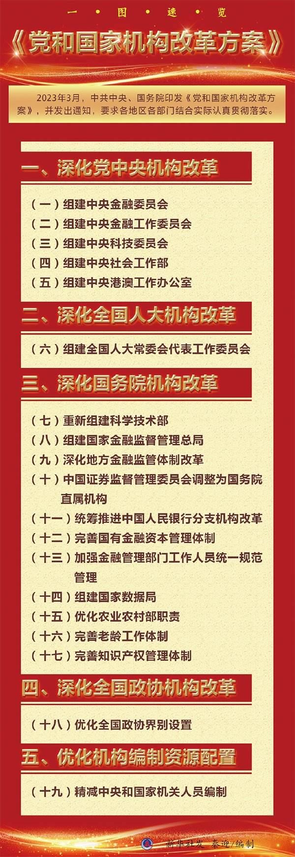 組建中央金融委員會、中央金融工作委員會、中央科技委員會、中央社會工作部、中央港澳工作辦公室;設立全國人大常委會代表工作委員會;重新組建科學技術(shù)部、組建國家金融監(jiān)督管理總局、深化地方金融監(jiān)管體制改革;全國政協(xié)界別增設“環(huán)境資源界”……在以習近平同志為核心的黨中央堅強領導下,黨和國家機構(gòu)改革正在平穩(wěn)有序推進。