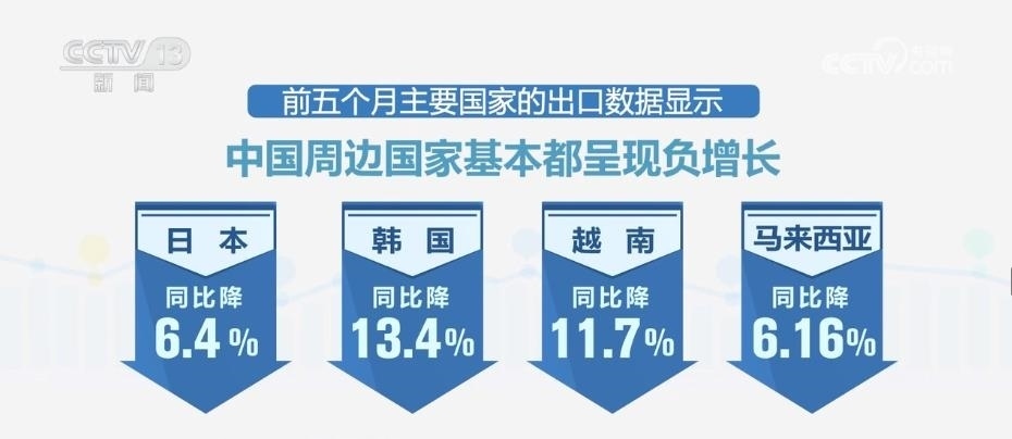 當(dāng)記者查閱主要國(guó)家前5個(gè)月的進(jìn)口數(shù)據(jù)時(shí)發(fā)現(xiàn),主要國(guó)家進(jìn)口額普遍下降,全球需求不振持續(xù)顯現(xiàn)。而前5個(gè)月主要國(guó)家的出口數(shù)據(jù)也顯示,中國(guó)周邊國(guó)家基本都呈現(xiàn)負(fù)增長(zhǎng),日本同比降6.4%、韓國(guó)同比降13.4%、越南同比降11.7%、馬來(lái)西亞同比降6.16%。