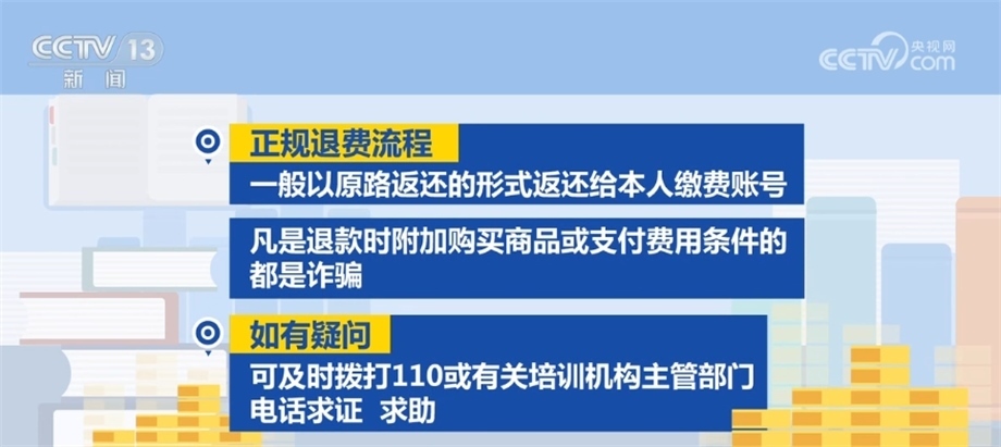 正規(guī)退費(fèi)流程一般以原路返還的形式返還給本人繳費(fèi)賬號(hào),凡是退款時(shí)附加購(gòu)買商品或支付費(fèi)用條件的都是詐騙。如有疑問(wèn),可及時(shí)撥打110或有關(guān)培訓(xùn)機(jī)構(gòu)主管部門電話求證、求助。