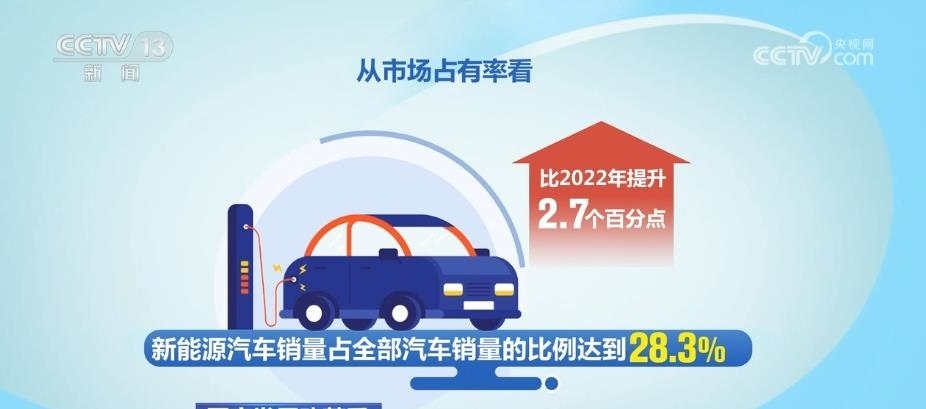 從市場占有率看,新能源汽車銷量占全部汽車銷量的比例達(dá)到28.3%,比2022年提升2.7個百分點。