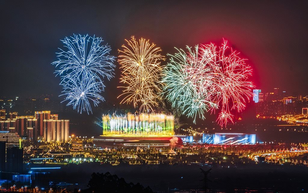 △2023年7月18日,成都大運會開幕式第一次帶焰火彩排。