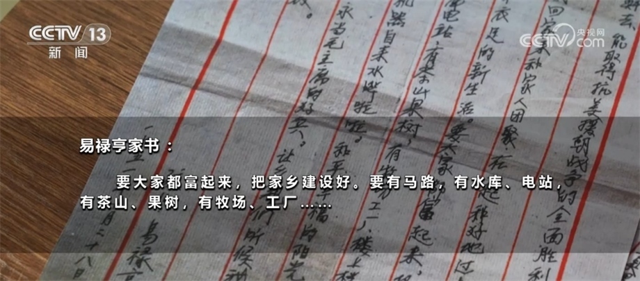 抱著與家人訣別的心情,年輕的易祿亨寫下了這封家書。除了戰(zhàn)場上的見聞和對家人的思念,他還寫下了對未來美好生活的憧憬:要大家都富起來,把家鄉(xiāng)建設好。要有馬路,有水庫、電站,有茶山果樹,有牧場、工廠……作為家中長子,瞞著父母走上戰(zhàn)場,易祿亨一直心懷愧疚。他希望通過這些文字,能讓父母理解自己的決定。