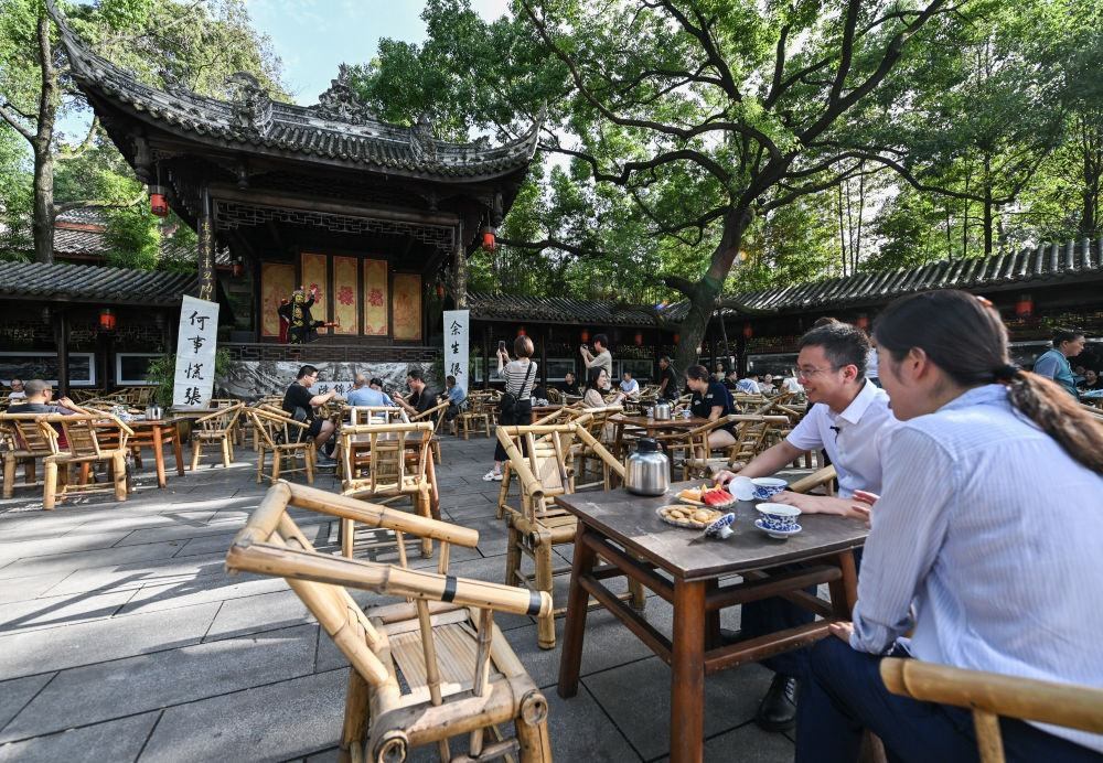7月14日,在成都高新區(qū)鐵像寺水街,游客在茶鋪體驗當(dāng)?shù)靥厣w碗茶。新華社記者 王曦 攝