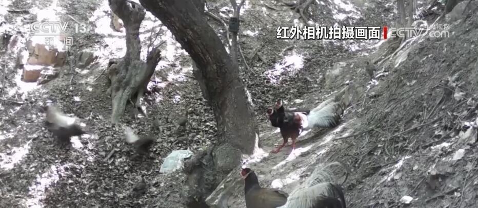 近日,在山西呂梁的孝義市國有林場,紅外相機記錄到國家一級保護野生動物褐馬雞最大種群。畫面中,先是兩群褐馬雞在兩棵老樹下覓食玩耍,兩個樹洞內積有雨水,它們不斷地前往飲水補給。突然,一只落單的成年褐馬雞入侵,遭到領地一只雄性褐馬雞的追逐驅趕。不同角度的紅外相機還捕捉到褐馬雞好奇對視相機、幼崽上樹打鬧等趣味十足的珍貴影像。