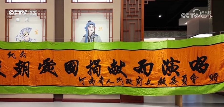 總臺記者 李恩浩:在河南省戲曲聲音博物館,有這樣一個十多米的條幅,上面寫著“為抗美援朝愛國捐獻而演唱”,這是香玉劇社義演的第一場,河南省人民政府特意為了支持他們的愛國行動贈送的,當時香玉劇社在全國義演時它就掛在舞臺上方。