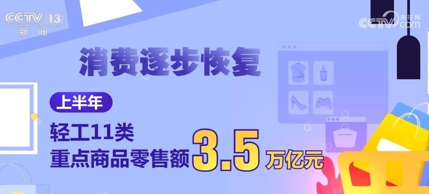 消費(fèi)逐步恢復(fù)。上半年,輕工11類(lèi)重點(diǎn)商品零售額3.5萬(wàn)億元,占社會(huì)消費(fèi)品零售總額的15.4%,同比增長(zhǎng)6.3%。