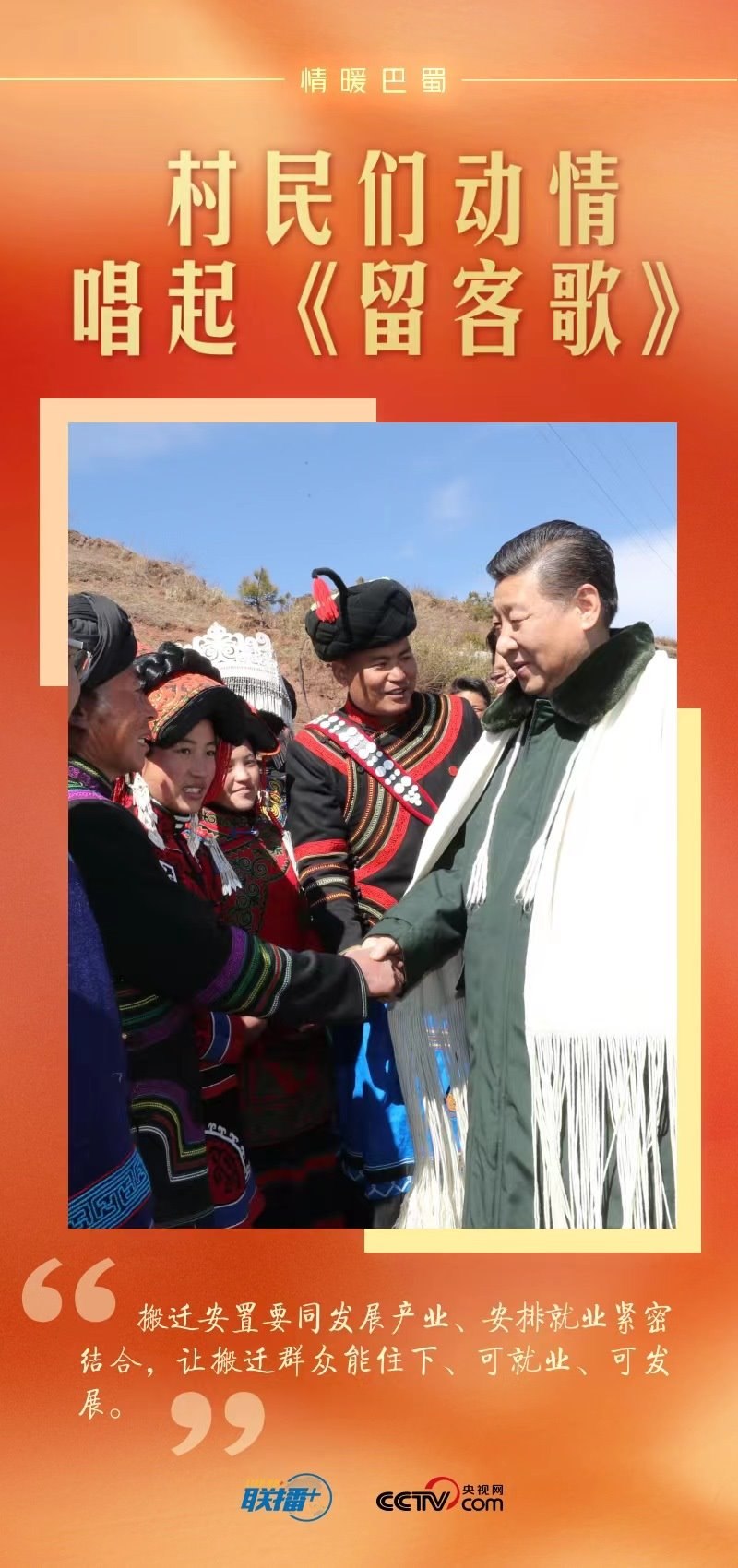 總書(shū)記離開(kāi)村子時(shí),身著彝族盛裝的鄉(xiāng)親們排起長(zhǎng)隊(duì)。村黨支部書(shū)記代表全村人向總書(shū)記獻(xiàn)上彝族傳統(tǒng)服飾查爾瓦,表達(dá)對(duì)總書(shū)記的愛(ài)戴之情。人群中有人唱起彝族民歌《留客歌》,鄉(xiāng)親們都跟著唱起來(lái)……掌聲、歌聲、歡呼聲在村子里久久回蕩。