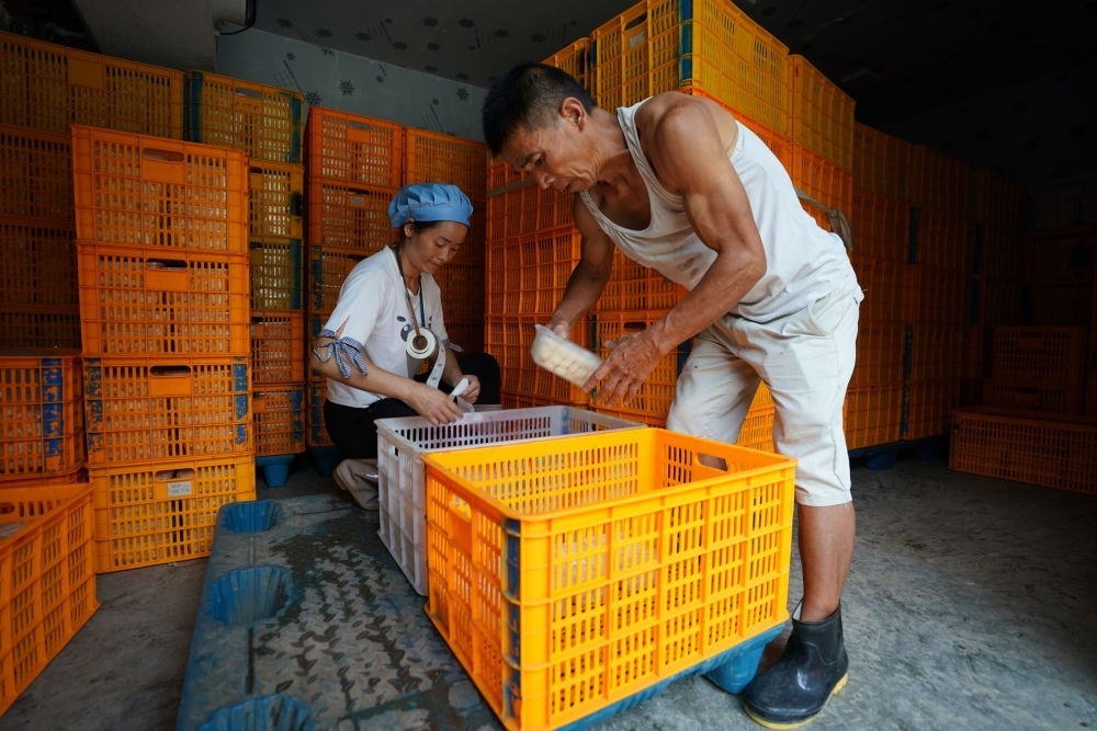 7月27日,兩名工人在劉禹丹的豆腐加工廠內工作。新華社記者 陳欣波 攝