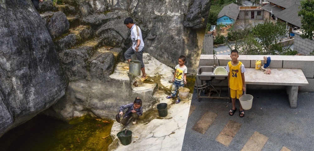 拼版照片:左圖為2014年拍攝的西疇縣巖頭村村民在石頭凹里取水,這些水是下雨時積的,當時小村民李大鑫(右)只有5歲(西疇縣融媒體中心供圖);右圖為2023年7月26日拍攝的西疇縣巖頭村村民李大鑫在自己家的院子里接自來水(新華社記者 費茂華 攝)。