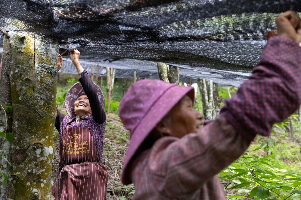 7月27日,工作人員在云南西疇縣西灑鎮(zhèn)的中藥材基地修補遮陽網。新華社記者 呂帥 攝