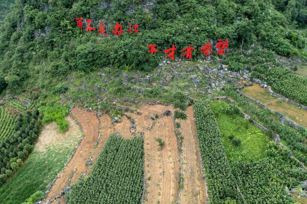 7月27日,一位村民在木者村“摸石谷”中建成的“三?!迸_地上干農活。新華社記者 楊植森 攝
