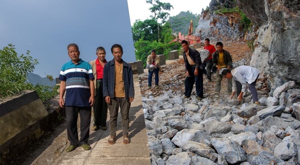 拼版照片:左圖為2009年謝成芬(前左)帶領村民一起修路時的資料照片(西疇縣融媒體中心供圖);右圖為2023年7月27日,謝成芬站在修好的出村公路上(新華社記者 費茂華 攝)。