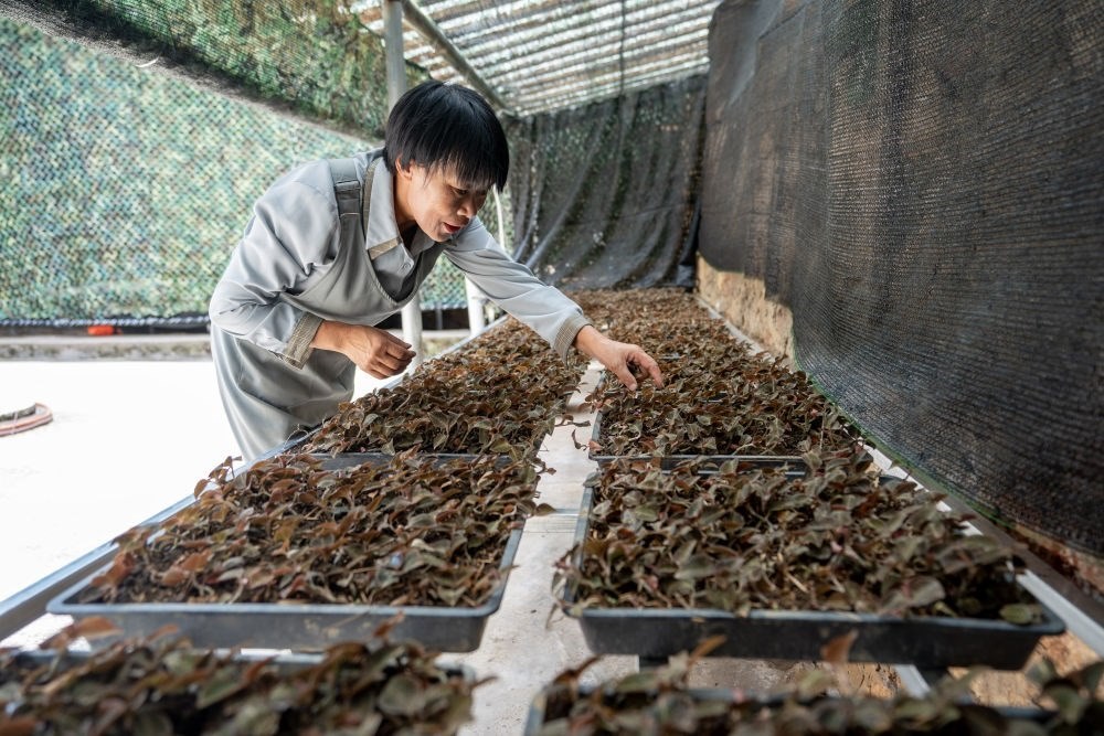 7月27日,謝成芬在家中搭建的大棚內打理人工種植的金線蓮植株。新華社記者 陳欣波 攝