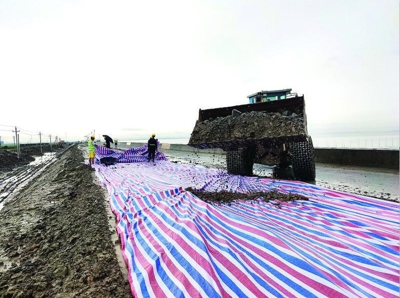 工作人員對海塘堤壩進(jìn)行加固。(受訪者供圖)