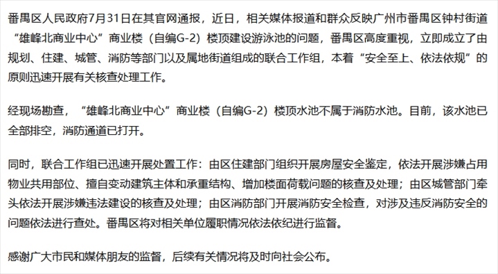 ·廣州番禺通報(bào)“樓頂建豪華泳池”:開(kāi)展涉嫌違法建設(shè)核查。