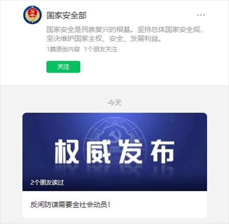 ·國家安全部官微亮相,發(fā)布首條推文《反間防諜需要全社會動員!》。